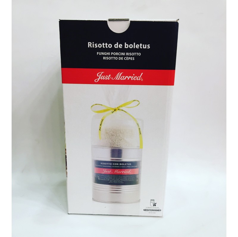 Arroz extra del Delta del Ebro (22%), caldo de boletus (agua, boletus 6% y sal), caldo de pollo (agua, pollo, puerro, zanahoria, cebolla, apio, sal y pimienta), cebolla, aceite de oliva, mantequilla, vino blanco (sulfitos) y sal.
