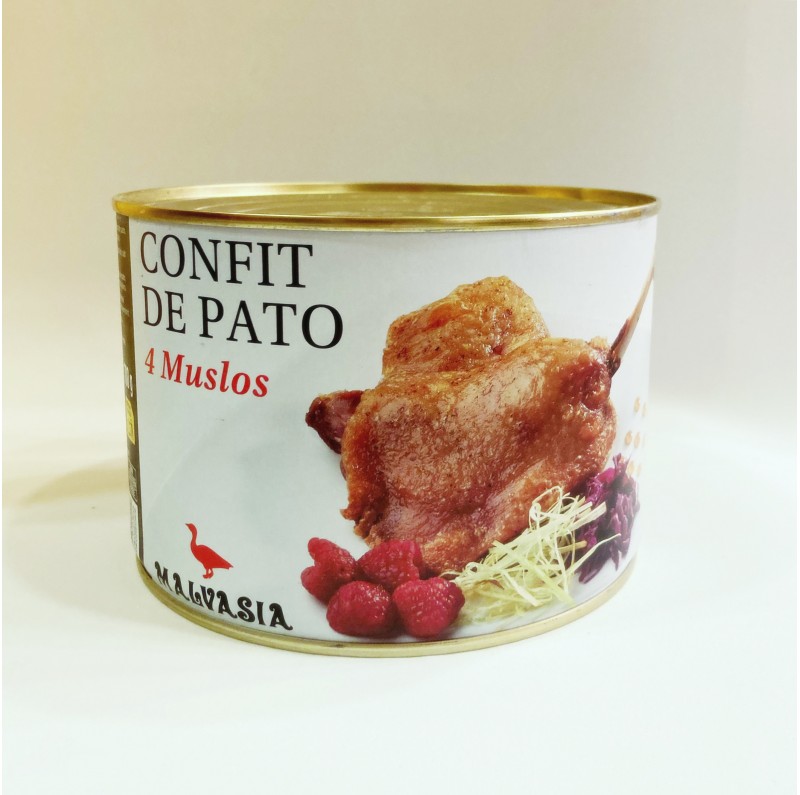 Cuatro espléndidos muslos de pato confitados y conservados en su propia grasa. Simplemente hay que desgrasar las piezas al baño maría y hornear hasta dorar la piel. Se recomienda servir los muslos acompañados de una salsa o mermelada de frutos rojos.