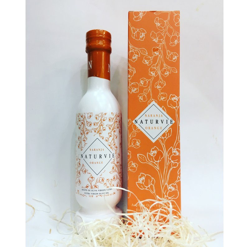 Maravilloso aceite de oliva virgen extra variedad Manzanilla Cacereña infusionado con corteza de naranja. Presentado en la exclusiva botella decanter diseñada por Martín Bersatagui que deposita cualquier sedimento o impureza en el fondo de la botella.