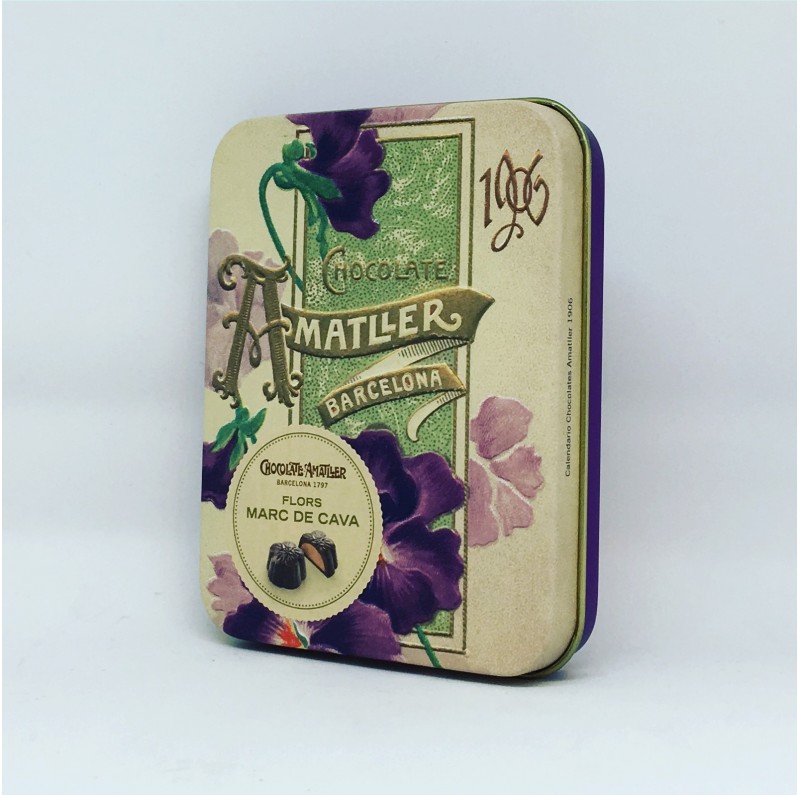 Pequeños bombones en forma de flor recubiertos de chocolate 50% cacao Ghana, con un interior de trufa al Marc de Cava. El Marc de Cava es un fino licor resultante de la destilación y envejecimiento de la madre y del orujo de la uva utilizada para la elaboración del Cava. Se trata de un bombón fresco y ligero, pero con carácter, que une el frescor volátil y la madera del Marc de Cava, y las notas de tostado y cremosidad de los granos de cacao Ghana. Su presentación no puede ser más bonita y elegante, con ilustraciones florales que nos llevan a la época del Art Nouveau.