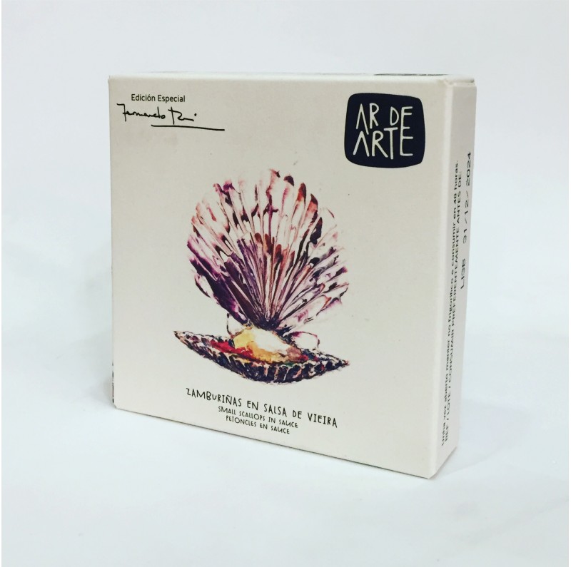 Ar de Arte es una conservera gallega situada en Carballo (A Coruña) que elabora unas conservas de primerísima calidad, cuidando al máximo los ingredientes. En este caso, han reinventado la tradicional salsa de vieira dándole su toque personal. En la lata, con un bonito diseño del artista gallego Fernando Rei, se pueden encontrar hasta 16 zamburiñas, deliciosamente cocinadas en una salsa a partir de aceite de oliva, tomate, cebolla, especias y sal. El truco final es un cocinado lento y con mucho mimo.